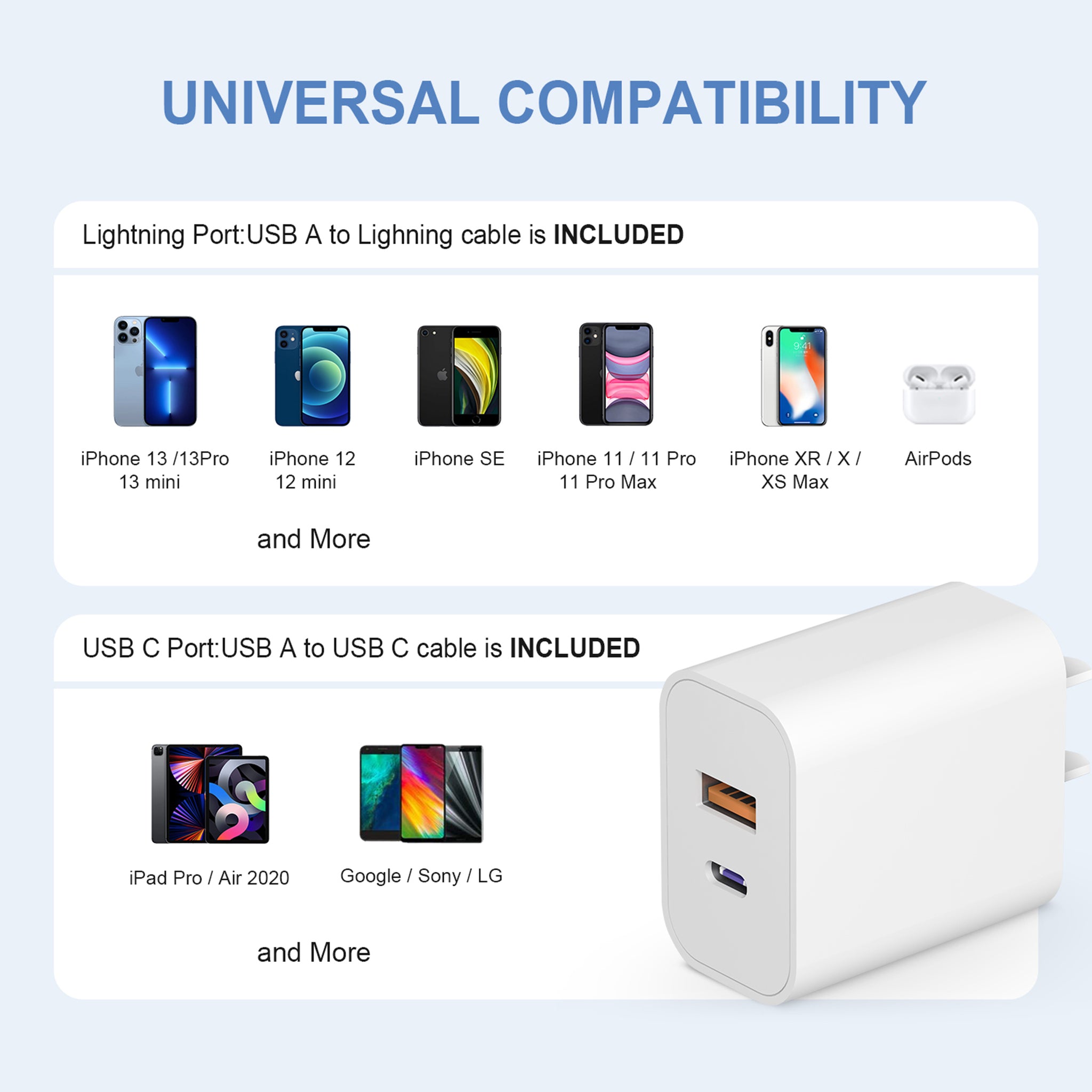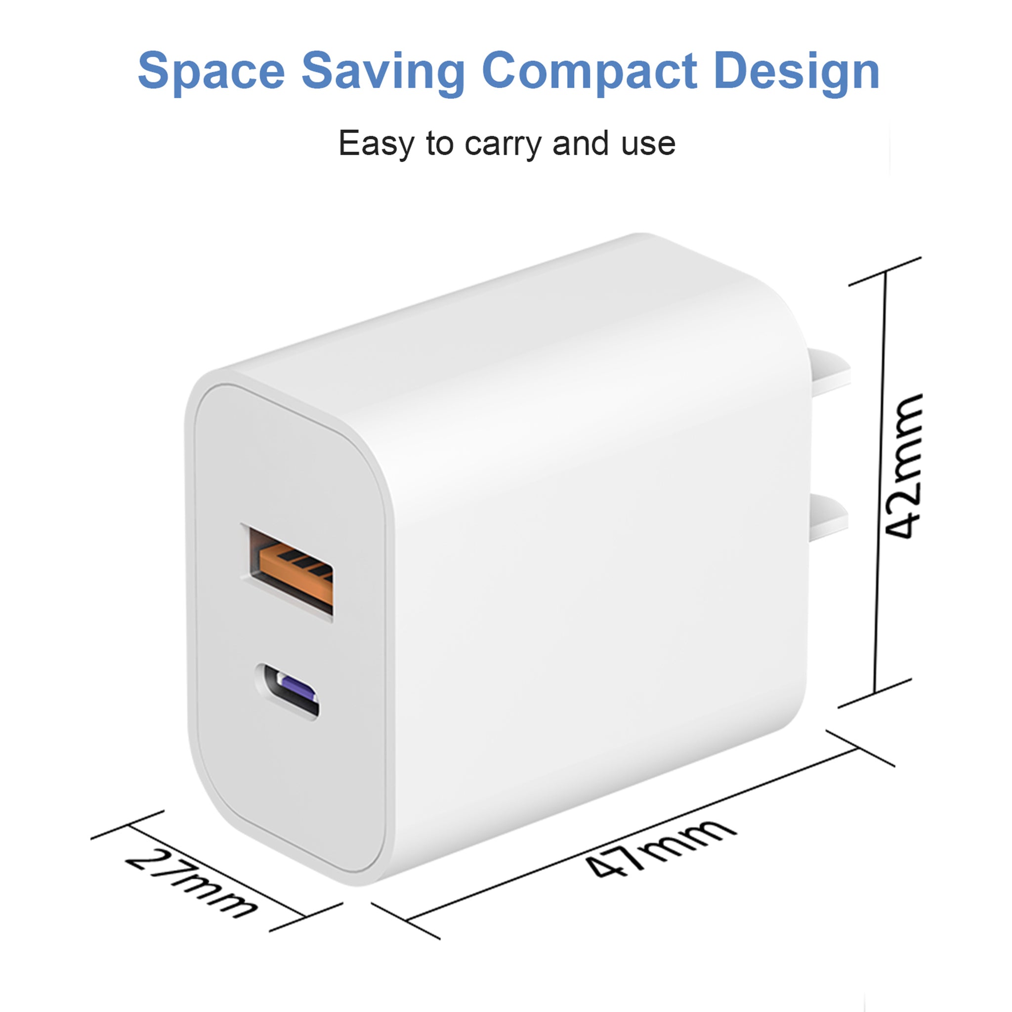 - [High-Speed Charging & Dual Port Design] Fast Charger Block with 20W of output power, USB-C and USB-A block frees you from messy chargers with various interfaces, ports to charge two devices simultaneously at high speed. Charging your iPhone 15 up to 50% in just 30 minutes, 75% faster than the ordinary 5W charger, saving over 1.5hrs for you.