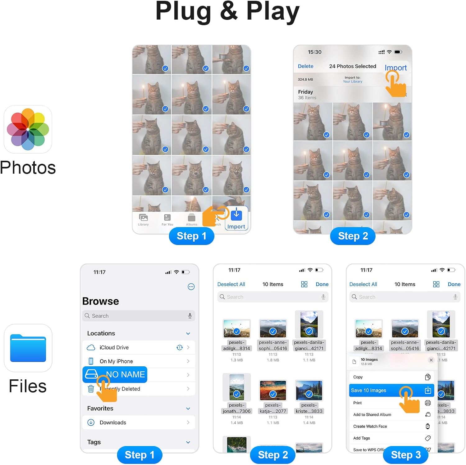 • 【Plug & Play】Just plug SD Card Reader Compatible with iPhone in and start transferring files. No additional apps required, use phone built-in “Photos” or “Files” app to start transferring files immediately. SD Card Reader Compatible with iPhone fits comfortably in your pocket or wallet, ensuring you always have access to your photos.