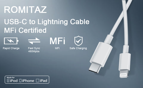 ROMITAZ USB C to Lightning cable 3x Faster for iPhone 12 12 Mini 12Pro 12 Pro Max, iPad, AirPods and support 3.0 fast charging via Power Delivery. It has 2 extra-long 6-foot power cord for greater flexibility. The ROMITAZ Fast charger cable is optimized for energy efficiency and safety and meets high industry standards.